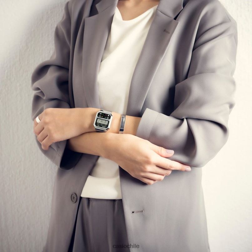 de casio vintage, nueva serie a100 con un diseño unisex y un elegante estilo retro. La serie a100 es una reproducción del f-100, el primer modelo con caja de resina de Casio. El diseño se ha actualizado para esta versión más moderna, conservando al mismo tiempo el diseño distintivo de los cuatro botones frontales del f-100 junto con elementos metálicos vintage de Casio. Las características y funciones incluyen capacidades de calendario y cronómetro, junto con resistencia al agua de uso diario e iluminación de luz LED para lectura fácil en la oscuridad. Las bandas cuentan con un cierre deslizante que le permite ajustar fácilmente la longitud de la banda sin herramientas especiales. el a100we-1avt viene en un clásico acero inoxidable plateado.
