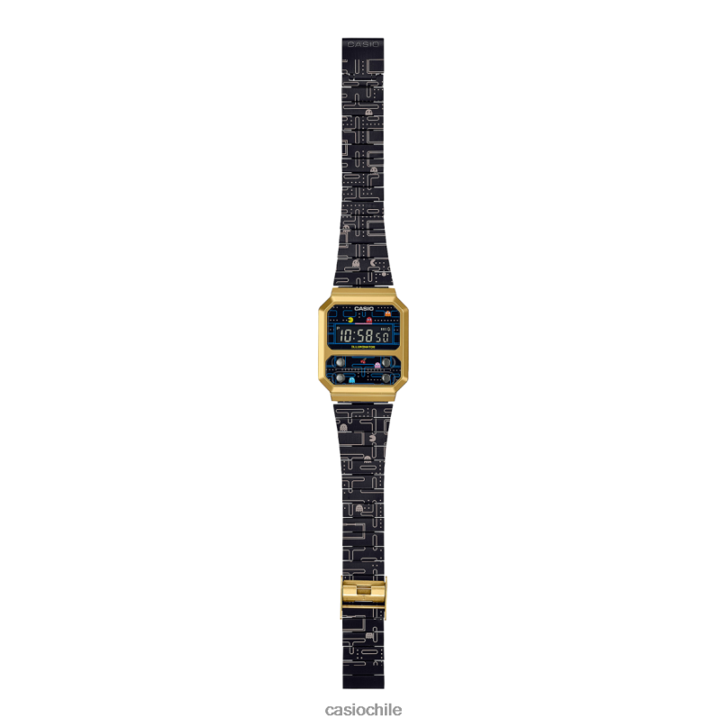 Dale la bienvenida a Pac-Man a tu vida con este especial Casio Vintage y Bandai Namco Entertainment Inc. colaboración. No pierdas esta oportunidad de agregar el a100 muy especial a tu colección. Sumérgete en la nostalgia de uno de los primeros videojuegos de gran éxito del mundo. Los detalles en el cristal del reloj insinúan la emocionante persecución que está a punto de desarrollarse cuando Pac-Man, rodeado por la casa fantasma con pantalla LCD cuadrada, está listo para comenzar a correr. El grabado láser en la banda de metal negro con baño de iones muestra el laberinto del juego. El juego comienza encima de la esfera del reloj con Pac-Man comiendo puntos mientras huye de los fantasmas y continúa debajo de la esfera después de devorar una bolita de energía y darse la vuelta para perseguirlos. Los gráficos originales de la pantalla del juego están grabados en la parte posterior de la caja. El embalaje está diseñado para evocar la clásica máquina recreativa de principio a fin. ¡Cómete este reloj verdaderamente único y devuelve la vida al espíritu de pac-man!pac-man & bandai namco entertainment inc.