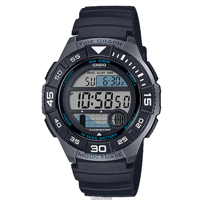 Resistencia al agua de 100 m/gráfico de mareas/fase lunar Resistencia al agua de 100 metros gráfico de mareas datos lunares (con indicador de edad lunar) 10 años de duración de la batería luz led hora dual Cronómetro de 1/100 segundo 3 alarmas diseño deportivo