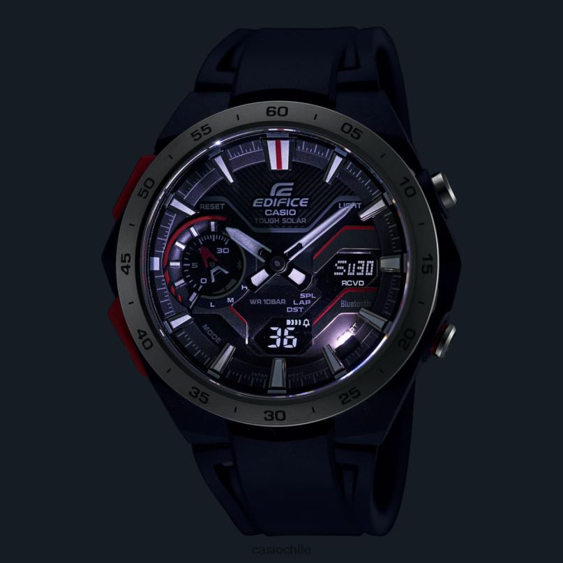 siente la pura emoción de un auto de carreras de fórmula arrasando la pista, con el edifice windflow ecb-2200p, un cronógrafo combinado digital-analógico inspirado en las pistas de carreras. La vista lateral, diseñada para evocar la sensación del viento que fluye a través de ella. un auto de carreras de fórmula con guardabarros y la cara mecánica nítida y dimensional presentan una apariencia única de pura velocidad. La caja de resina reforzada con fibra de carbono aporta resistencia, pero mantiene el reloj liviano para un diseño muy portátil. Las cuatro aberturas de la pulsera evocan el aspecto de las salidas de aire de los coches deportivos y sirven para mejorar la transpirabilidad al llevar el reloj. Es muy fácil sincronizarlo con su teléfono inteligente a través de Bluetooth. acceda a la aplicación para acceder a funciones que son tan importantes para los equipos de carreras: ajuste automáticamente el cronometraje de precisión al segundo, administre sin esfuerzo la hora mundial, transfiera datos del cronómetro medidos al milisegundo para hasta 200 tiempos de vuelta a su teléfono inteligente y use Súper iluminador para iluminar la cara analógica. Lata solar resistenteCargue el reloj de la luz solar o incluso de la luz de una lámpara fluorescente, almacenando suficiente energía para hasta 7 meses de uso normal. el cristal de zafiro resistente a los arañazos ofrece una durabilidad que puede soportar los inevitables golpes y rasguños que experimentan los mecánicos de automóviles.