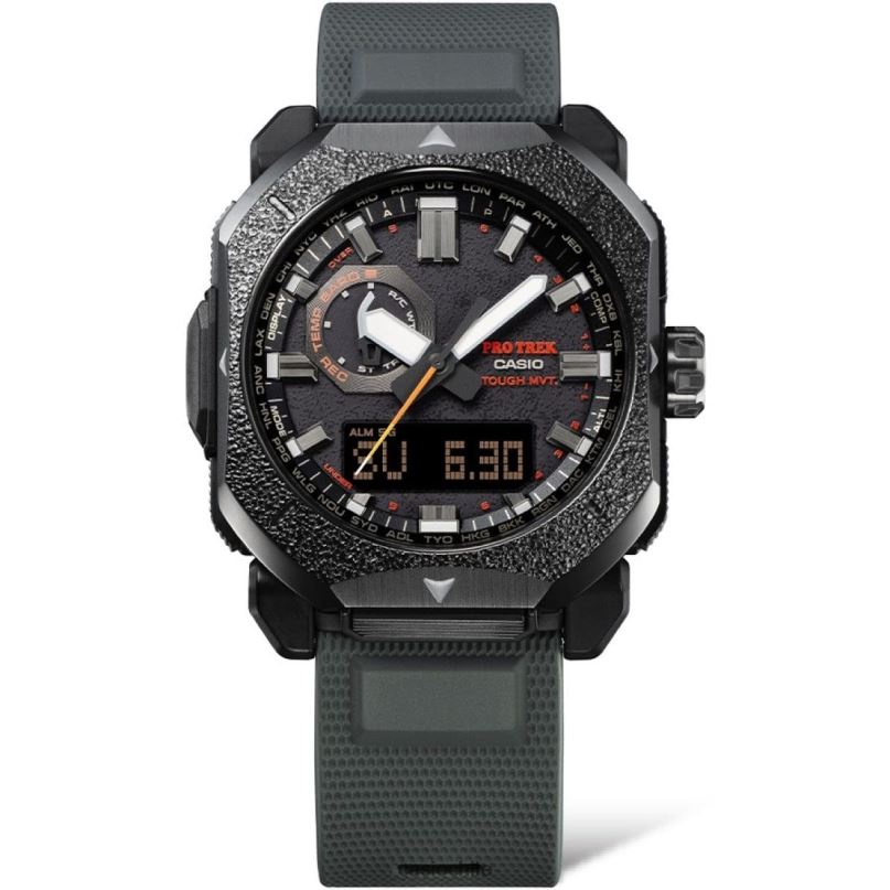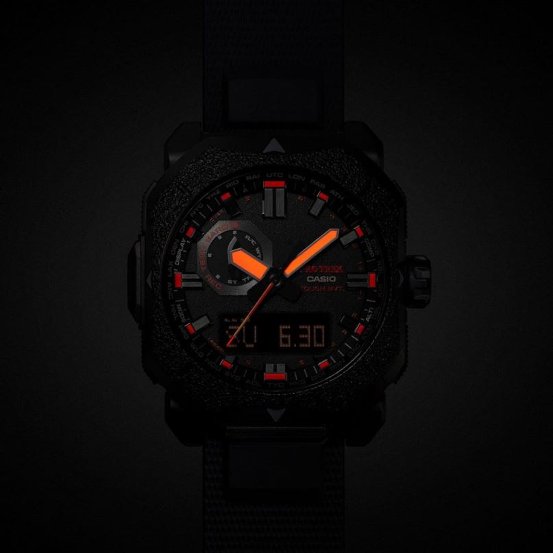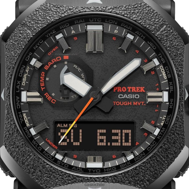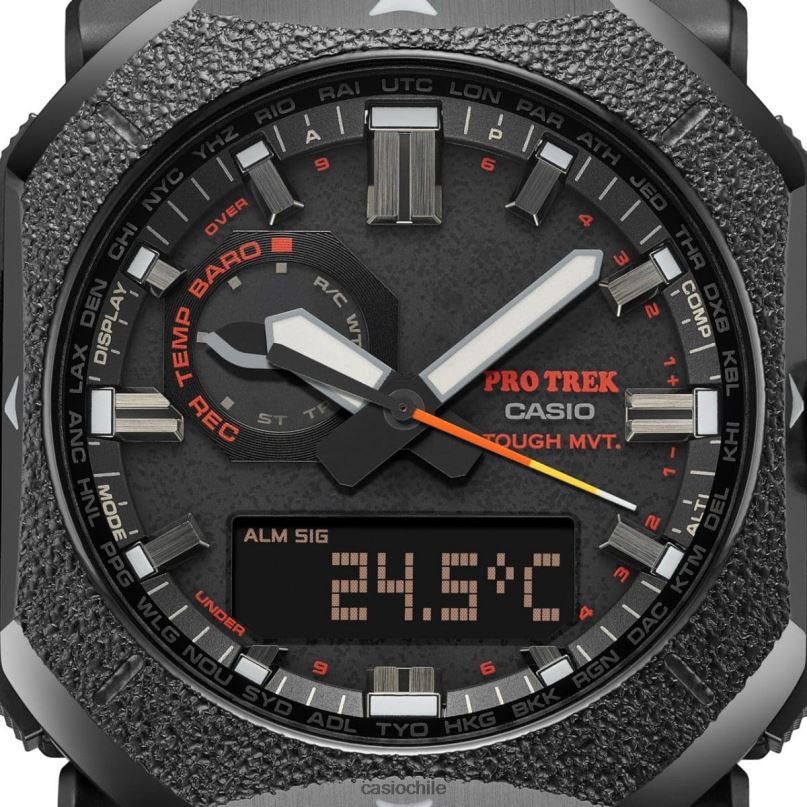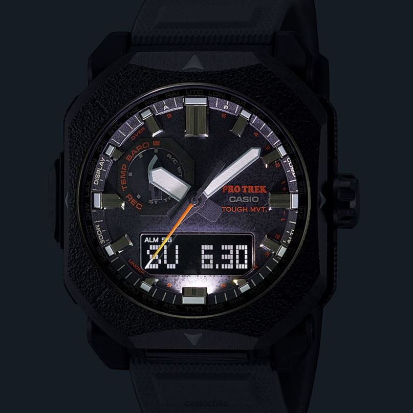 Sea atrevido. ¡Explora el aire libre! obtenga el pro trek prw6900bf que presenta un diseño resistente que rebosa el espíritu de aventura en la naturaleza, aprovechando el material, el color y el acabado. Con un bisel de metal octogonal que reproduce la textura del hierro fundido, se combinan materiales luminiscentes que emiten un tenue resplandor rojo en la oscuridad. colocados en las puntas de las manecillas de las horas y los minutos, el segundero y los índices de la esfera. Evocando las llamas de una fogata y más, materiales, colores y acabados cuidadosamente seleccionados, este reloj transmite un enfoque áspero y resistente para acampar, como el bushcraft. Con funciones de alto rendimiento como sensor triple, control de radio y carga solar, esta es una pieza de equipo para actividades al aire libre que integra practicidad con atractivo estético. El sensor triple de brújula digital, barómetro/altímetro y termómetro lo ayuda a estar al tanto de los cambios. en el entorno natural, mientras que a esta variedad de funciones, se suma el rendimiento de casio con carga solar resistente, control de radio multibanda 6,y resistencia al agua hasta 100 metros, y estarás listo para la acción dondequiera que vayas.