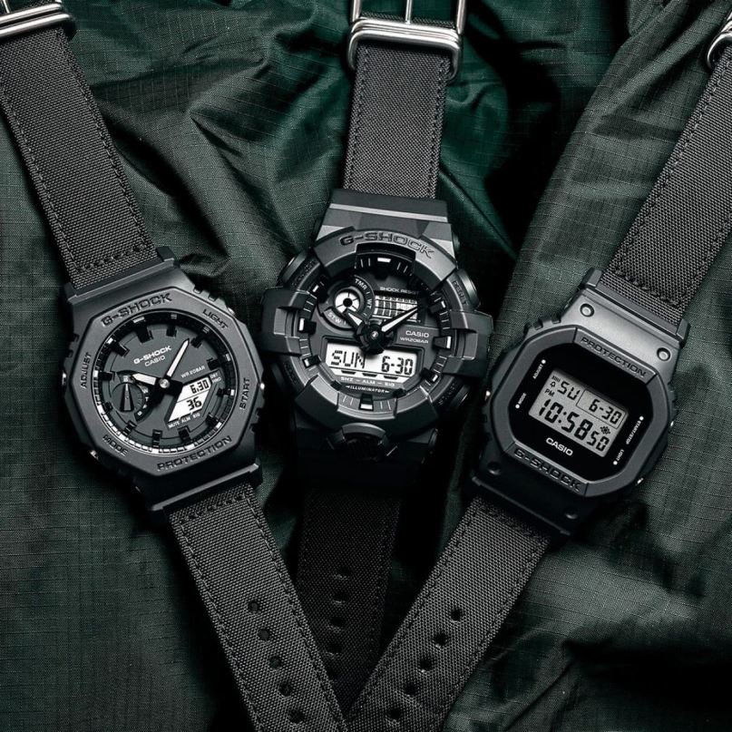 Utilitario, inteligente en la calle y con mentalidad natural al mismo tiempo: este g-shock con correa de nailon cordura cumple todos los requisitos. El moderno diseño completamente negro se complementa con una correa hecha de nailon cordura respetuoso con el medio ambiente, creando un Aspecto moderno y versátil que te lleva sin problemas del trabajo al juego. Elige entre tres modelos: el icónico dw5600, el ga2100 con bisel octogonal o el estuche grande ga700.
