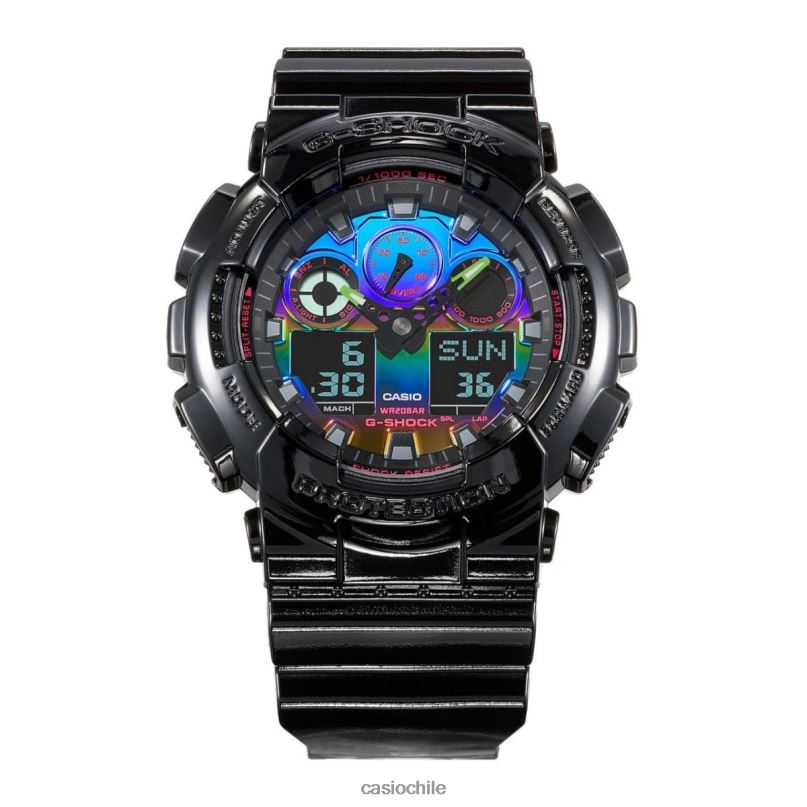aventúrese en la línea de arco iris virtual: explore el espectro colorido que surge cuando la estética del mundo del juego cibertecnológico se encuentra con la búsqueda de g-shock de la máxima resistencia. Los biseles y las bandas presentan un color negro brillante, mientras que las esferas presentan una deposición de vapor de arco iris. y diseños multicolores. el resultado es una gama de looks atrevidos en prismas de colores fríos que iluminan la oscuridad y que arrasan en cualquier escena de moda.