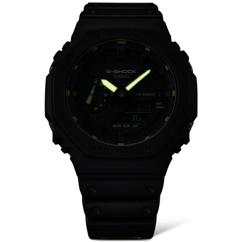 Causa sensación con el color contrastado con el negro mate en un diseño especial que resalta con detalles en neón. La forma octogonal y el diseño aerodinámico del ga-2100 incorporan un negro mate texturizado y un color neón vibrante para una nueva apariencia elegante y fresca. Las manecillas de las horas y los minutos con pintura fosforescente permanecen visibles en la oscuridad para que puedas seguir jugando todo el día y la noche.