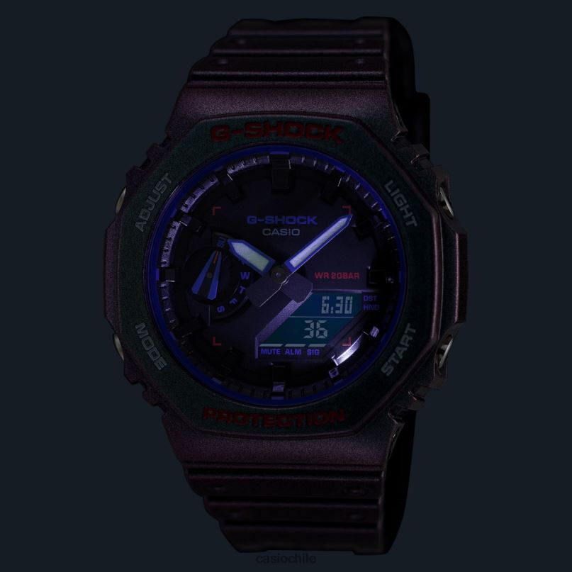 para aquellos que aspiran más alto en el mundo virtual... ¡y en la vida real! Presentamos g-shock inspirado en la determinación que se necesita para llegar a los niveles más altos de los juegos de computadora y de supervivencia. Los jugadores saben lo que se necesita para obtener una puntuación alta en los juegos de acción y disparos. Estos relojes recrean el apasionante y cambiante mundo del juego con pintura polarizada en violeta y verde que cambia de color según el ángulo de visión. Detalles como una mira telescópica para fijar la vista en el objetivo se incorporan en detalles en naranja y gráficos en la pantalla LCD para un diseño divertido que se mueve sin problemas entre el mundo real y el virtual. elige tu favorito: el octogonal ga2100ah o el clásico digital dwb5600ah con bluetooth
