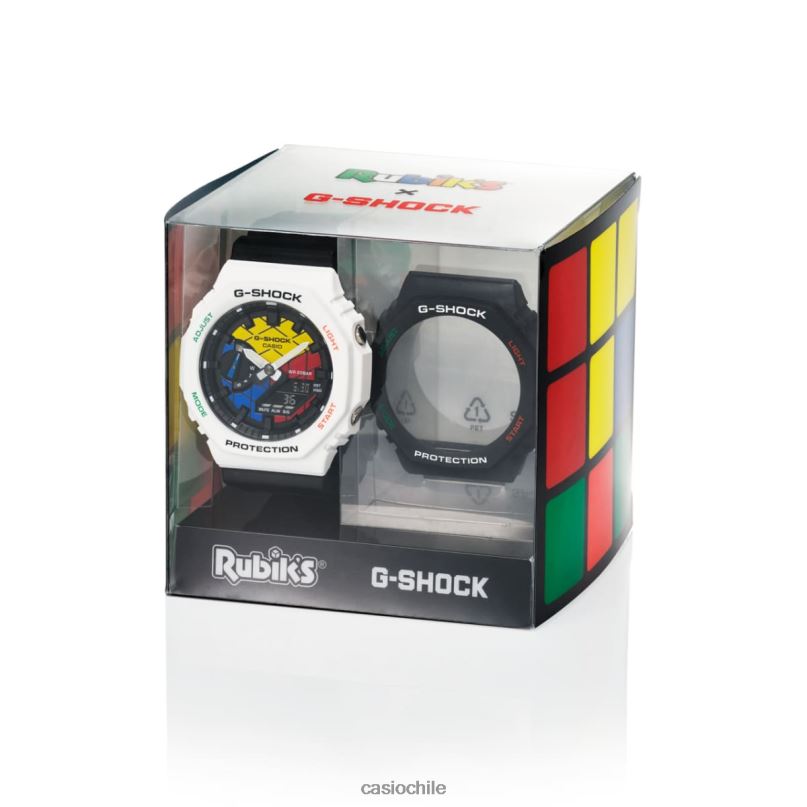 Presentamos la colaboración de edición limitada de Rubik's x G-Shock, basada en el ga2100 más vendido. Al igual que su inspiración en el cubo de Rubik, un lavado de cara está a solo una vuelta de distancia, y cada reloj cuenta con un bisel y una herramienta intercambiables.