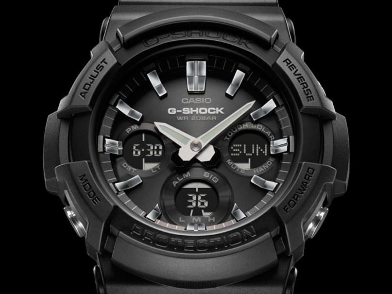 De g-shock, la marca de relojes que constantemente establece nuevos estándares en cuanto a resistencia del cronometraje, llegan nuevos modelos basados ​​en el resistente solargas-100 de caja grande. Las variaciones de un diseño negro básico se crean mediante tres biseles diferentes. El gas-100 viene con un bisel de acero inoxidable para un diseño estándar que combina bien con una amplia gama de estilos de moda, mientras que el gas-100g tiene un bisel de acero inoxidable con un acabado con baño de iones de oro para darle un toque de belleza distintiva. El gas-100b tiene un bisel de aluminio negro para un diseño atractivo. Se utiliza un proceso de moldeado original de Casio para producir marcadores de hora recubiertos por deposición que se combinan con los biseles metálicos para crear una apariencia de elegancia. Súper iluminador (doble) con función de cambio de mano solar resistente que ilumina la cara y la pantalla digital