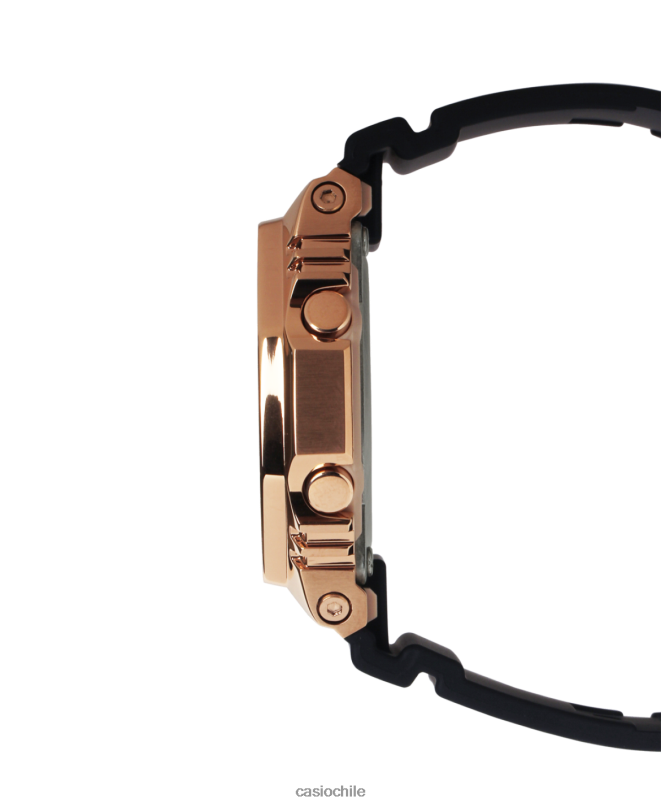 Vuélvete delgado, limpio y audaz con una banda de resina negra de tamaño mediano gms2100pg1a4 en una versión octogonal revestida de metal del icónico diseño original. Forjado en acero inoxidable con un acabado fino redondeado, el fuerte bisel de oro rosa dice súper estilo en todo forma. Sólo las letras en la parte superior e inferior están grabadas, para un diseño simple de una sola pieza. la esfera, aplanada para lograr delgadez, está tratada con un baño de iones de color e índices espejados para agregar profundidad brillante.