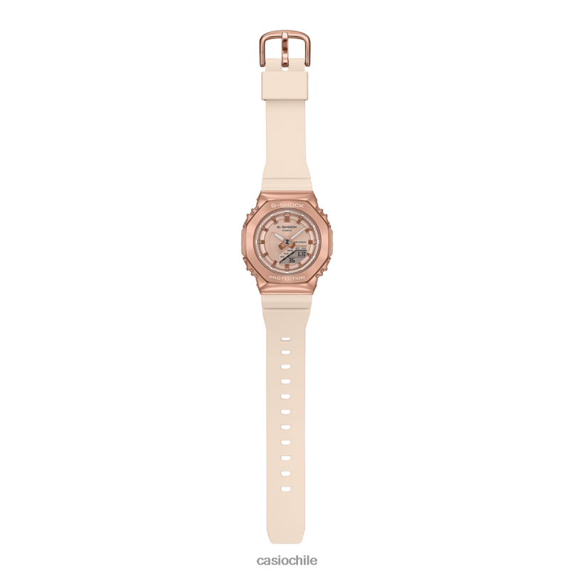 brilla y brilla con oro rosa sobre beige rosa en un g-shock más pequeño y compacto. Con un acabado en baño de iones de oro rosa, el bisel de metal transmite elegancia premium en todo momento. la hebilla, también con baño de iones en oro rosa, contrasta maravillosamente con la banda rosa beige para hacer que el metal realmente brille. Sumérgete en un oro rosa reluciente impregnado de sofisticación segura de ti mismo.