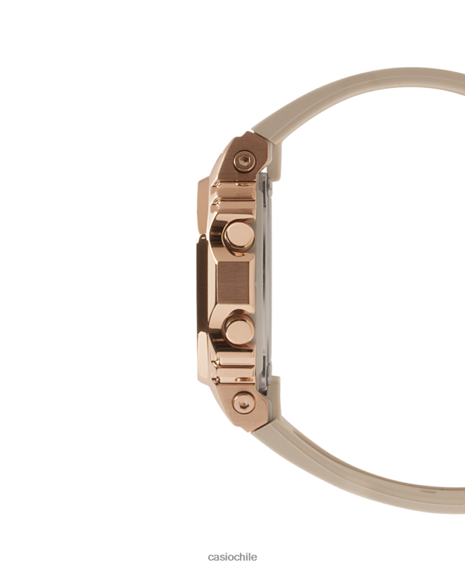 un modelo de tamaño reducido de la icónica serie 5600 acabado con metal lujoso. El diseño cuadrado del gm-5600, que se ha utilizado desde el primer modelo, se ha reducido para lograr un ajuste ligero y cómodo. la cubierta del bisel está hecha de metal con baño de iones de oro rosa y la correa es una elegante banda g-shock en color beige.