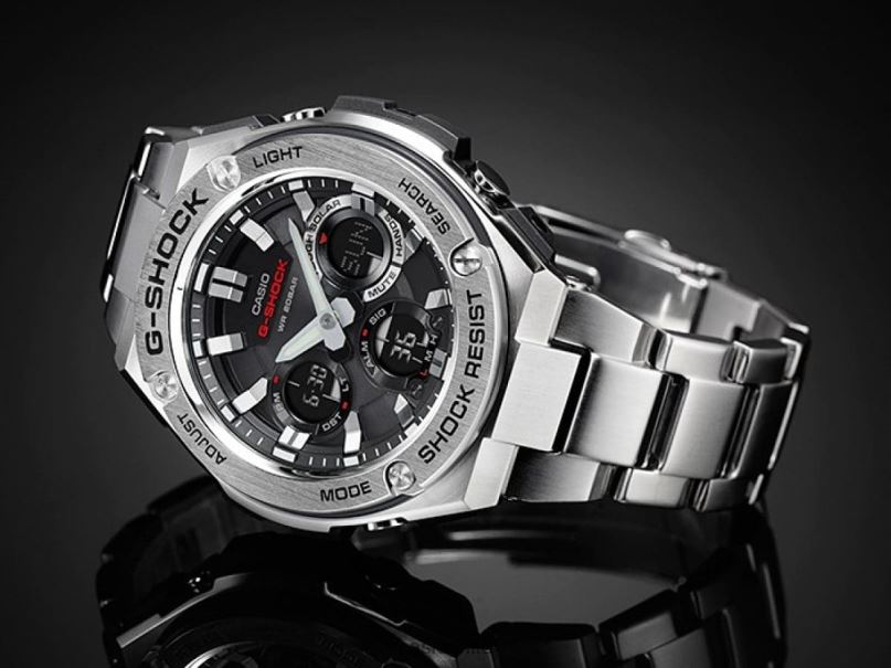 De g-shock, la marca de relojes que constantemente establece nuevos estándares en resistencia al cronometraje, llega g-steel, una serie de relojes con una nueva estructura de protección de capas. Se utilizan diferentes materiales en el bisel para crear una estructura de dos capas. que añade una nueva dimensión de resistencia a los golpes. para los modelos que utilizan acero inoxidable en la parte superior, se emplea resina amortiguadora en la parte inferior. si se usa resina en la parte superior, se usa resina fina en la parte inferior para amortiguar el impacto de la parte superior. Esto también ha hecho posible crear una amplia gama de diseños diferentes. El modelo gst-s110 expresa la dureza y la belleza del metal. Una función de cambio de mano aparta temporalmente las manos con solo presionar un botón para facilitar la lectura de la pantalla digital. contenidos, mientras que la iluminación frontal de doble LED mantiene la información fácil de leer en todo momento.